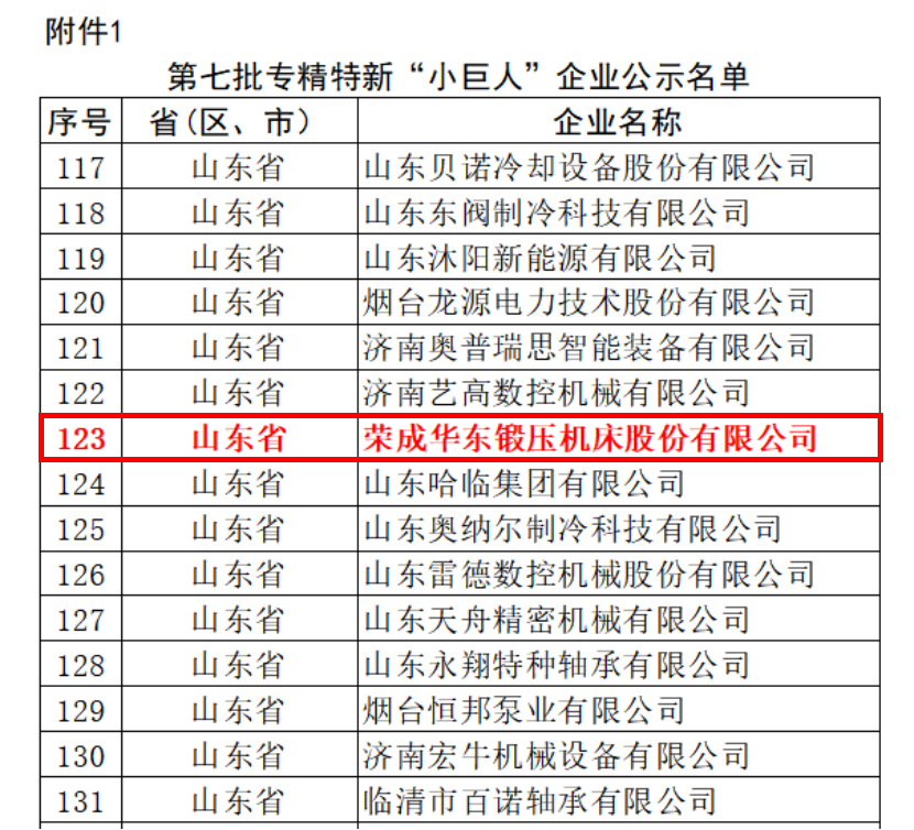 近日,山東省工業和信息化廳公布《關于山東省第七批專精特新”小巨人”企業名單公示》,榮成華東鍛壓機床股份有限公司憑借其在金屬成形機床高端裝備領域突出的創新能力、技術實力和市場地位,成功入選。這一國家級榮譽的獲得,標志著榮成華東鍛壓機床股份有限公司在專業化、精細化、特色化、新穎化的發展道路上取得里程碑式的成就。